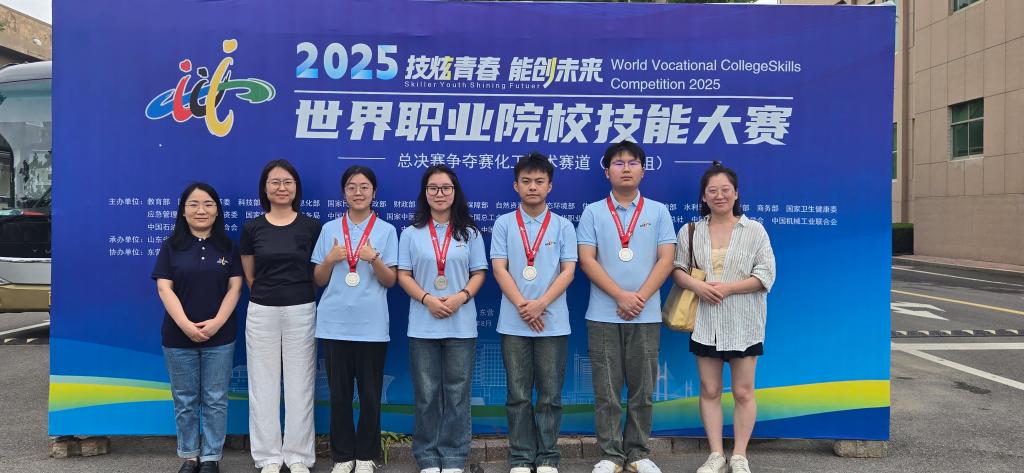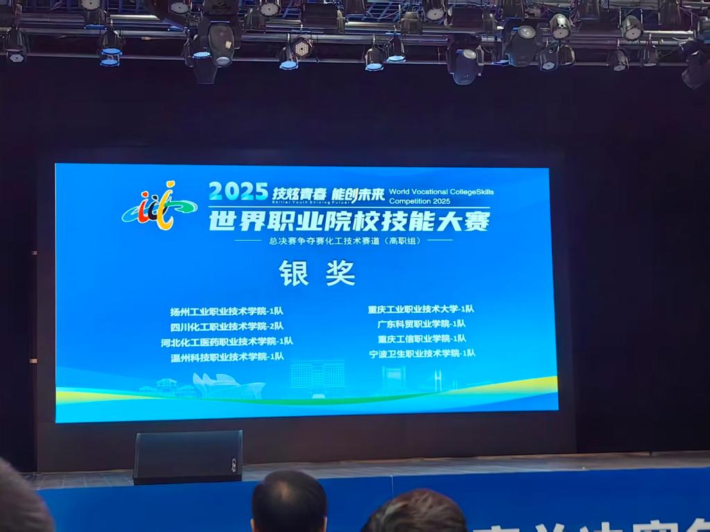 在2025年世界职业院校技能大赛总决赛争夺赛化工技术赛道(高职组)中,重庆工业职业技术大学化学与制药工程学院代表队1队杨超,邓瑾瑶,李长春,吴雅喧,在邓冬莉,赵洋洋,常禹老师的指导下,凭借扎实的技术功底与出色的现场发挥,斩获银奖,展现了卓越的专业素养和团队协作精神。